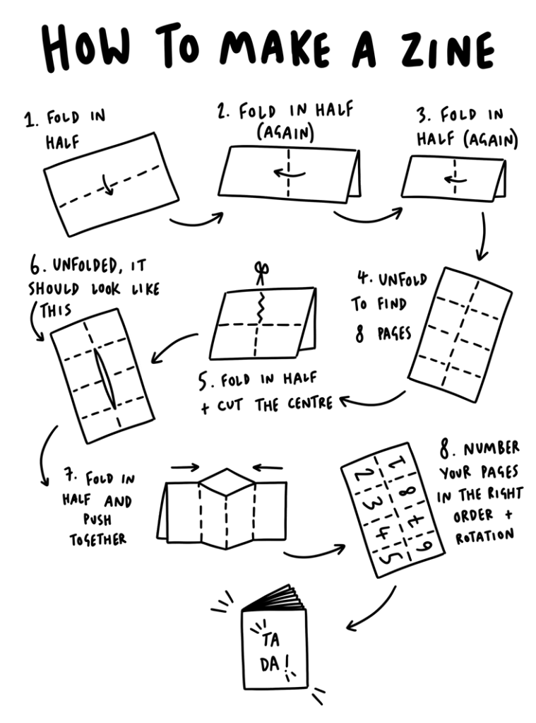 This helpful graphic is from: https://www.42ndstreet.org.uk/support/read/how-to-make-your-own-zine/.