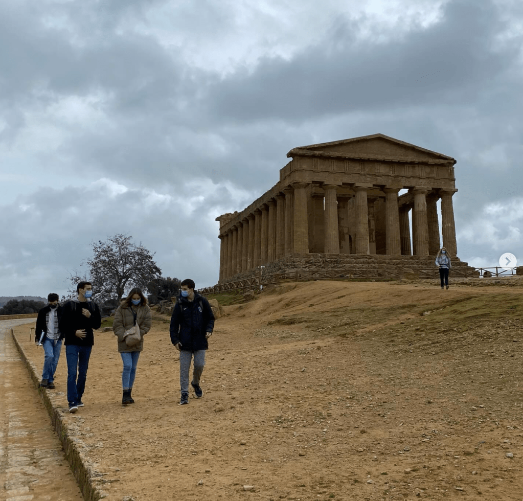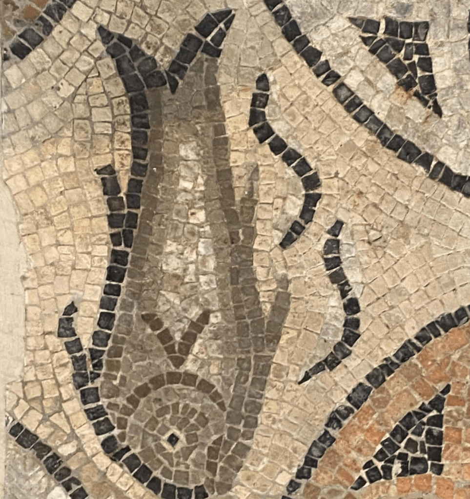 Images 1) skeleton mosaic from Pompeii; 2) a simple mosaic of a fish shows how placing different color tiles next to each other creates the illusion of dimension; 3) mosaic floor from Pompeii with the four colors supposedly mentioned by Empedocles; 4) classical Greek temple in Agrigento.