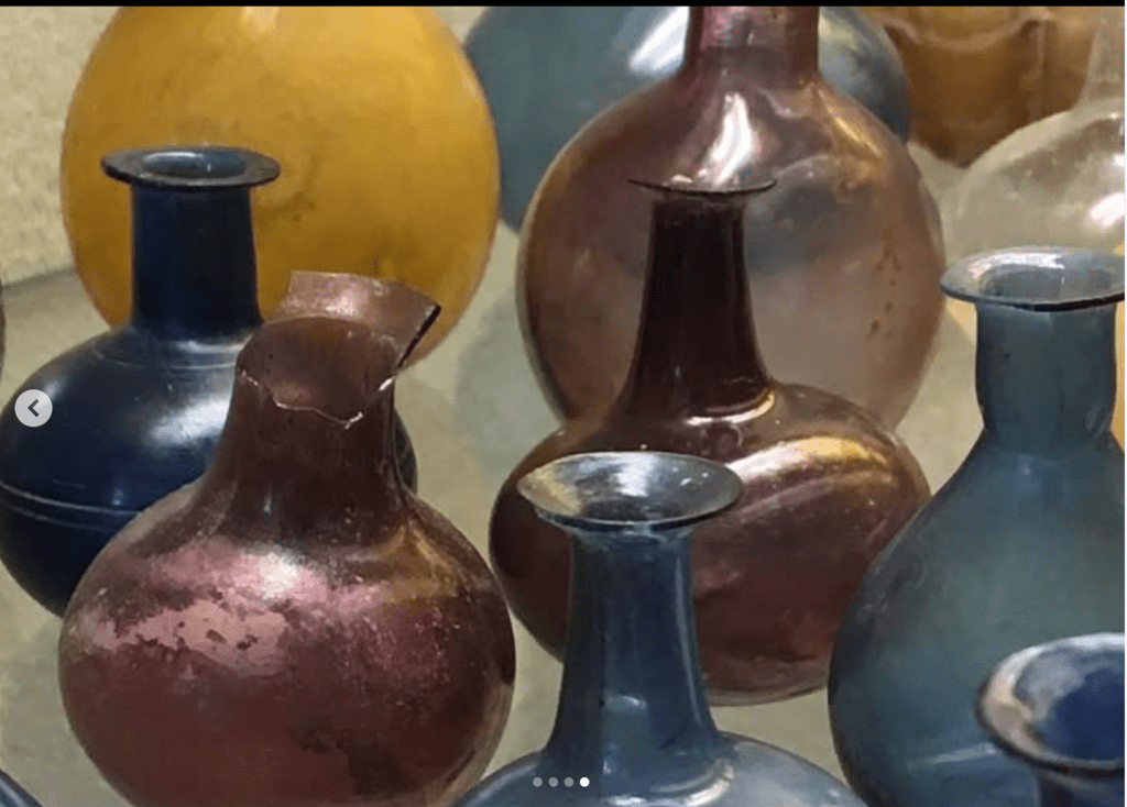 Images: 1) Roman Glass from Pompeii (Naples Arch Museum); 2) Crystals. Cefalu, Sicily. 3) A Roman glass vessel in the shape of a fish that is yellowish in color. British Museum. 4) Brightness and darkness in transparent colored glass. Bodrum, Turkey. 5) White agate intaglio with Athena and Mercury, Istanbul Arch Museum.